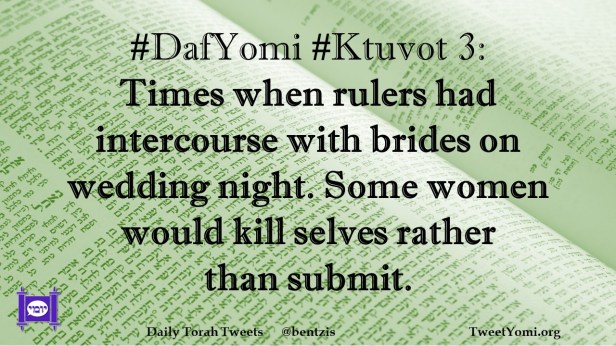 DafYomi, Ktuvot #DafYomi #Ktuvot 3 Date: July 8, 2022Author: ysspitz #DafYomi #Ktuvot 3: Times when rulers had intercourse with brides on wedding night. Some women would kill selves rather than submit. Share this: Share on X (Opens in new window) X Share on Facebook (Opens in new window) Facebook Like Loading... Related