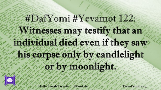 DafYomi, Yevamot #DafYomi #Yevamot 122 Date: July 8, 2022Author: ysspitz #DafYomi #Yevamot 122: Witnesses may testify that an individual died even if they saw his corpse only by candlelight or by moonlight. Share this: Share on X (Opens in new window) X Share on Facebook (Opens in new window) Facebook Like Loading... Related