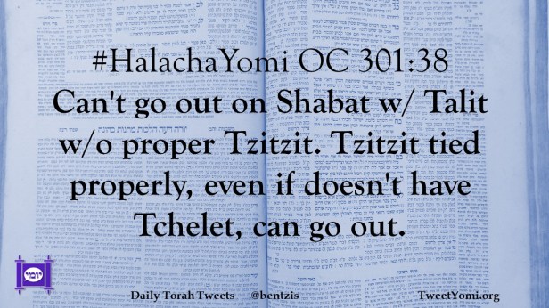 #HalachaYomi OC 301:38 Can’t go out on Shabat w/ Talit w/o proper Tzitzit. Tzitzit tied properly, even if doesn’t have Tchelet, can go out.