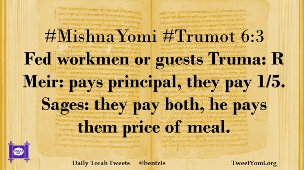 #MishnaYomi #Trumot 6:3 Fed workmen or guests Truma: R Meir: pays principal, they pay 1/5. Sages: they pay both, he pays them price of meal.