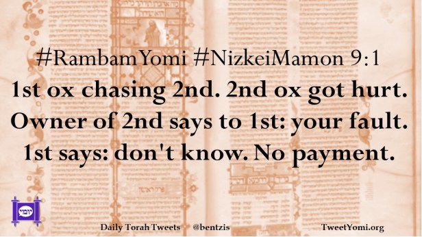 #RambamYomi #NizkeiMamon 9:1 1st ox chasing 2nd. 2nd ox got hurt. Owner of 2nd says to 1st: your fault. 1st says: don’t know. No payment.