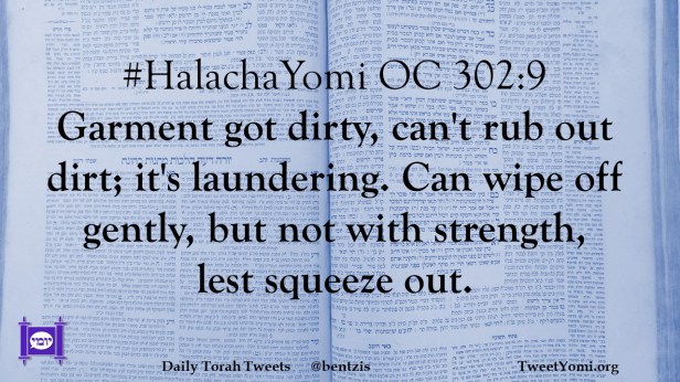 #HalachaYomi OC 302:9 Garment got dirty, can’t rub out dirt; it’s laundering. Can wipe off gently, but not with strength, lest squeeze out.