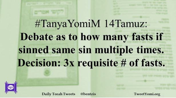 TanyaYomiM #TanyaYomiM 14Tamuz Date: July 14, 2022Author: ysspitz #TanyaYomiM 14Tamuz: Debate as to how many fasts if sinned same sin multiple times. Decision: 3x requisite # of fasts. Share this: Share on X (Opens in new window) X Share on Facebook (Opens in new window) Facebook Like Loading... Related