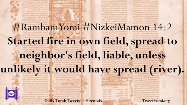 #RambamYomi #NizkeiMamon 14:2 Started fire in own field, spread to neighbor’s field, liable, unless unlikely it would have spread (river).