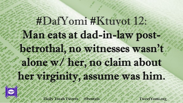 DafYomi, Ktuvot #DafYomi #Ktuvot 12 Date: July 18, 2022Author: ysspitz #DafYomi #Ktuvot 12: Man eats at dad-in-law post-betrothal, no witnesses wasn’t alone w/ her, no claim about her virginity, assume was him. Share this: Share on X (Opens in new window) X Share on Facebook (Opens in new window) Facebook Like Loading... Related
