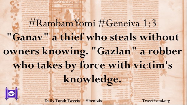 #RambamYomi #Geneiva 1:3 “Ganav” a thief who steals without owners knowing. “Gazlan” a robber who takes by force with victim’s knowledge.
