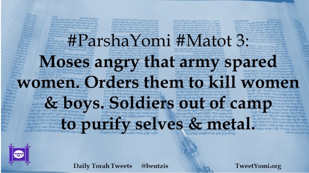 #ParshaYomi #Matot 3: Moses angry that army spared women. Orders them to kill women & boys. Soldiers out of camp to purify selves & metal.
