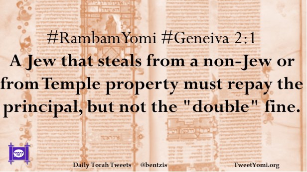 #RambamYomi #Geneiva 2:1 A Jew that steals from a non-Jew or from Temple property must repay the principal, but not the “double” fine.