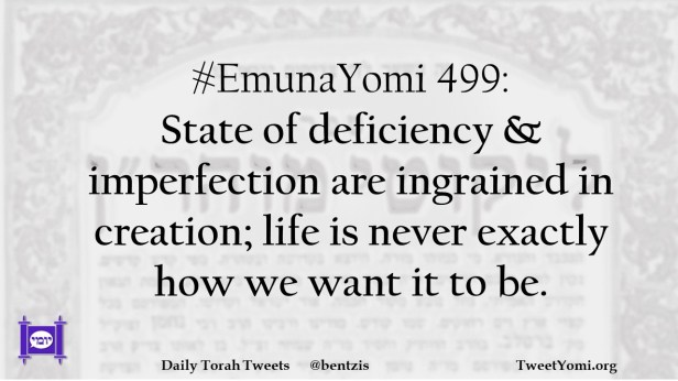 EmunaYomi #EmunaYomi 499 Date: July 21, 2022Author: ysspitz #EmunaYomi 499: State of deficiency & imperfection are ingrained in creation; life is never exactly how we want it to be. Share this: Share on X (Opens in new window) X Share on Facebook (Opens in new window) Facebook Like Loading... Related