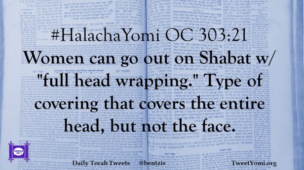 #HalachaYomi OC 303:21 Women can go out on Shabat w/ “full head wrapping.” Type of covering that covers the entire head, but not the face.