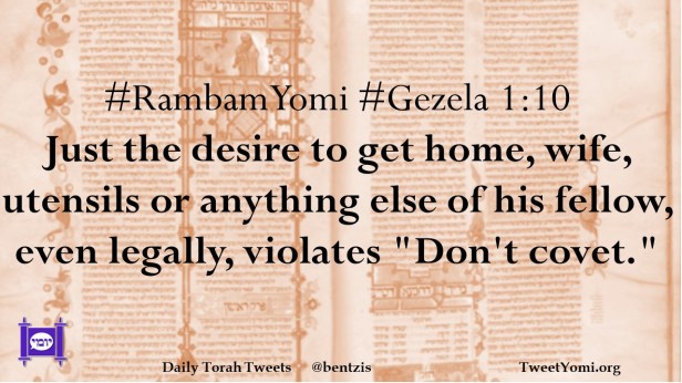#RambamYomi #Gezela 1:10 Just the desire to get home, wife, utensils or anything else of his fellow, even legally, violates “Don’t covet.”