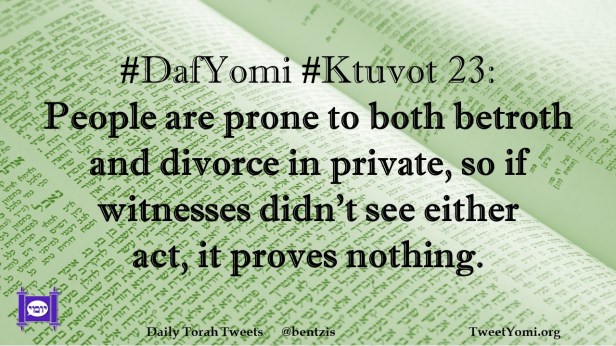 DafYomi, Ktuvot #DafYomi #Ktuvot 23 Date: July 29, 2022Author: ysspitz #DafYomi #Ktuvot 23: People are prone to both betroth and divorce in private, so if witnesses didn’t see either act, it proves nothing. Share this: Share on X (Opens in new window) X Share on Facebook (Opens in new window) Facebook Like Loading... Related