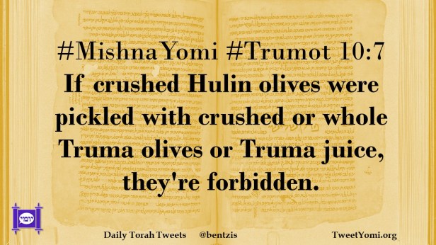 #MishnaYomi #Trumot 10:7 If crushed Hulin olives were pickled with crushed or whole Truma olives or Truma juice, they’re forbidden.
