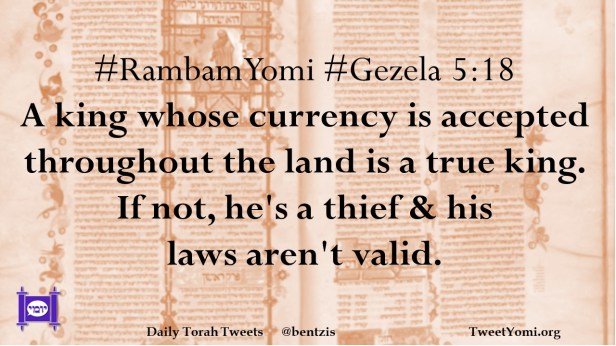 #RambamYomi #Gezela 5:18 A king whose currency is accepted throughout the land is a true king. If not, he’s a thief & his laws aren’t valid.