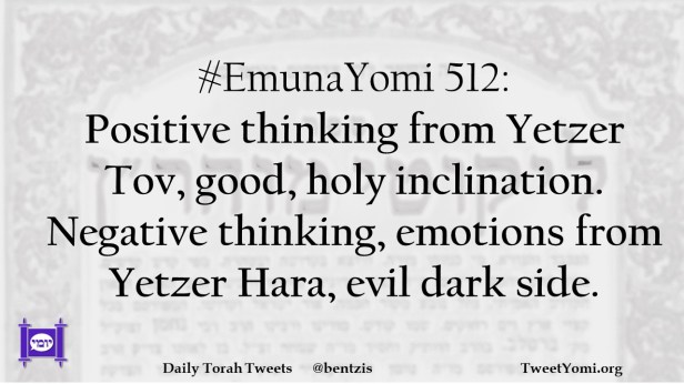 #EmunaYomi 512: Positive thinking from Yetzer Tov, good, holy inclination. Negative thinking, emotions from Yetzer Hara, evil dark side.