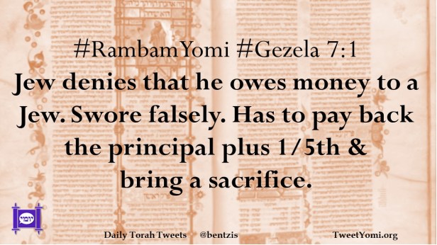 #RambamYomi #Gezela 7:1 Jew denies that he owes money to a Jew. Swore falsely. Has to pay back the principal plus 1/5th & bring a sacrifice.