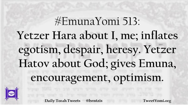#EmunaYomi 513: Yetzer Hara about I, me; inflates egotism, despair, heresy. Yetzer Hatov about God; gives Emuna, encouragement, optimism.
