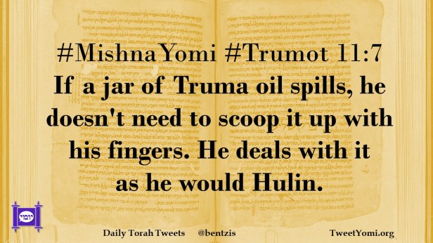 #MishnaYomi #Trumot 11:7 if a jar of Truma oil spills, he doesn’t need to scoop it up with his fingers. He deals with it as he would Hulin.