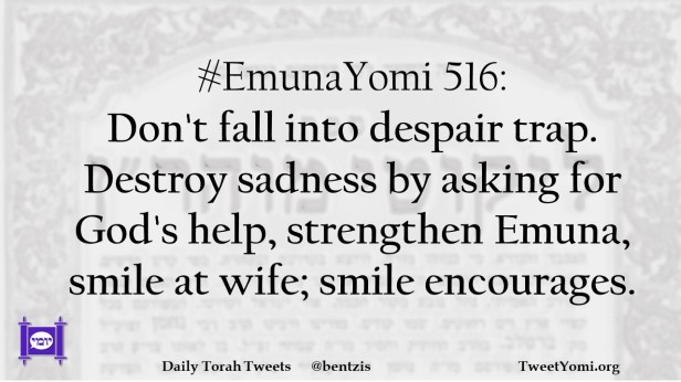 #EmunaYomi 516: Don’t fall into despair trap. Destroy sadness by asking for God’s help, strengthen Emuna, smile at wife; smile encourages.