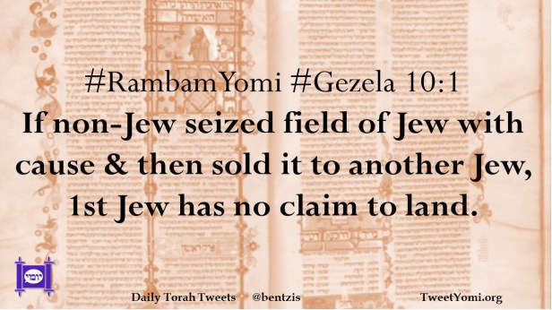 #RambamYomi #Gezela 10:1 If non-Jew seized field of Jew with cause & then sold it to another Jew, 1st Jew has no claim to land.