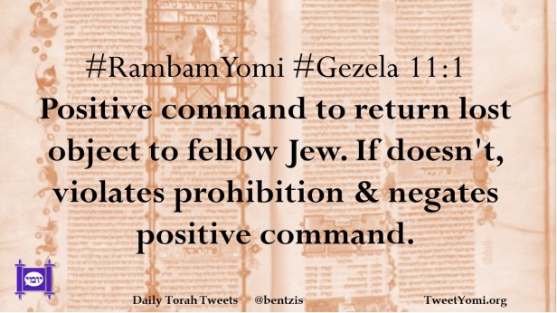 #RambamYomi #Gezela 11:1 Positive command to return lost object to fellow Jew. If doesn’t, violates prohibition & negates positive command.