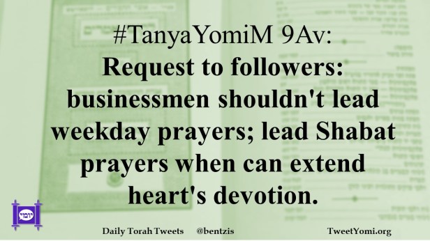 #TanyaYomiM 9Av: Request to followers: businessmen shouldn’t lead weekday prayers; lead Shabat prayers when can extend heart’s devotion.