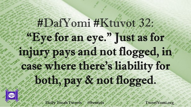 DafYomi, Ktuvot #DafYomi #Ktuvot 32 Date: August 7, 2022Author: ysspitz #DafYomi #Ktuvot 32: “Eye for an eye.” Just as for injury pays and not flogged, in case where there’s liability for both, pay & not flogged. Share this: Share on X (Opens in new window) X Share on Facebook (Opens in new window) Facebook Like Loading... Related