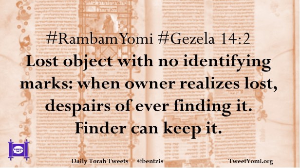#RambamYomi #Gezela 14:2 Lost object with no identifying marks: when owner realizes lost, despairs of ever finding it. Finder can keep it.