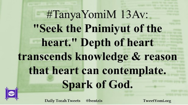 #TanyaYomiM 13Av: “Seek the Pnimiyut of the heart.” Depth of heart transcends knowledge & reason that heart can contemplate. Spark of God.