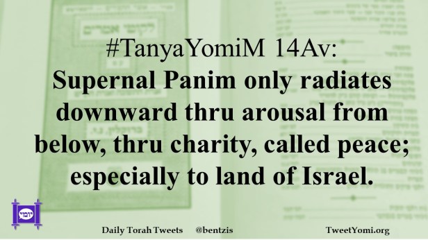#TanyaYomiM 14Av: Supernal Panim only radiates downward thru arousal from below, thru charity, called peace; especially to land of Israel.