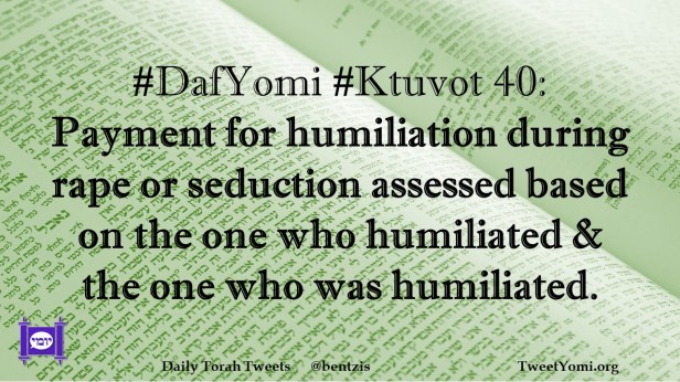 DafYomi, Ktuvot #DafYomi #Ktuvot 40 Date: August 15, 2022Author: ysspitz #DafYomi #Ktuvot 40: Payment for humiliation during rape or seduction assessed based on the one who humiliated & the one who was humiliated. Share this: Share on X (Opens in new window) X Share on Facebook (Opens in new window) Facebook Like Loading... Related