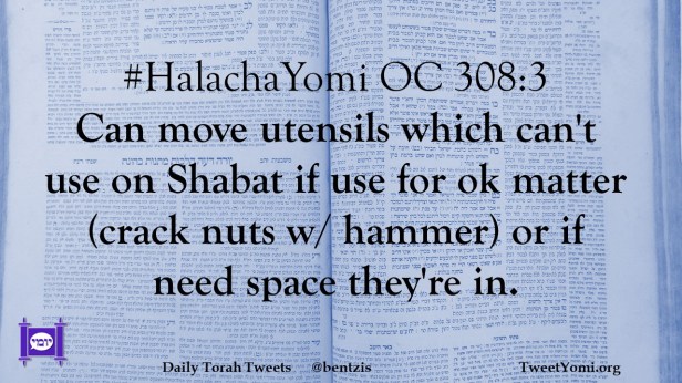 #HalachaYomi OC 308:3 Can move utensils which can’t use on Shabat if use for ok matter (crack nuts w/ hammer) or if need space they’re in.
