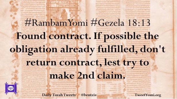 #RambamYomi #Gezela 18:13 Found contract. If possible the obligation already fulfilled, don’t return contract, lest try to make 2nd claim.