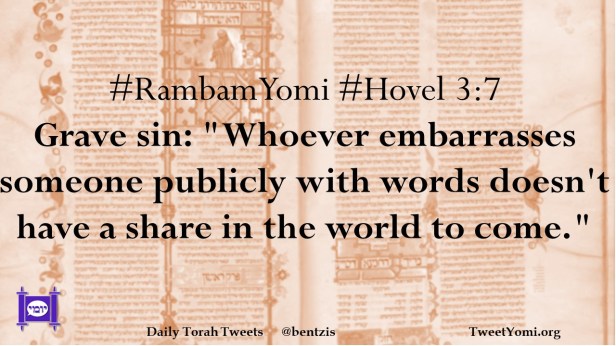 #RambamYomi #Hovel 3:7 Grave sin: “Whoever embarrasses someone publicly with words doesn’t have a share in the world to come.”