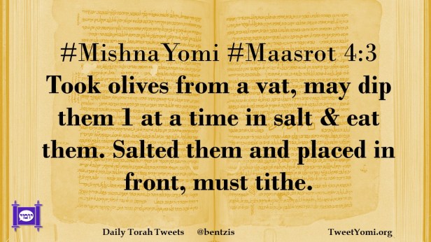 #MishnaYomi #Maasrot 4:3 Took olives from a vat, may dip them 1 at a time in salt & eat them. Salted them and placed in front, must tithe.