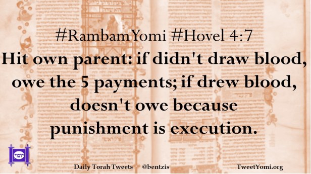 #RambamYomi #Hovel 4:7 Hit own parent: if didn’t draw blood, owe the 5 payments; if drew blood, doesn’t owe because punishment is execution.
