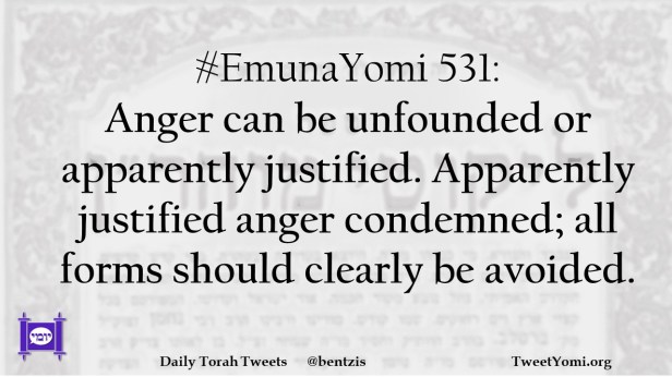 #EmunaYomi 531: Anger can be unfounded or apparently justified. Apparently justified anger condemned; all forms should clearly be avoided.