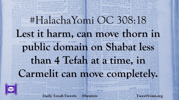 #HalachaYomi OC 308:18 Lest it harm, can move thorn in public domain on Shabat less than 4 Tefah at a time, in Carmelit can move completely.