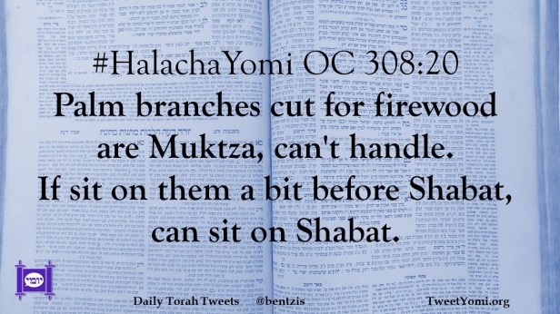 #HalachaYomi OC 308:20 Palm branches cut for firewood are Muktza, can’t handle. If sit on them a bit before Shabat, can sit on Shabat.