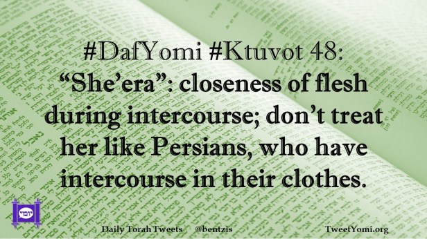 DafYomi, Ktuvot #DafYomi #Ktuvot 48 Date: August 28, 2022Author: ysspitz #DafYomi #Ktuvot 48: “She’era”: closeness of flesh during intercourse; don’t treat her like Persians, who have intercourse in their clothes. Share this: Share on X (Opens in new window) X Share on Facebook (Opens in new window) Facebook Like Loading... Related