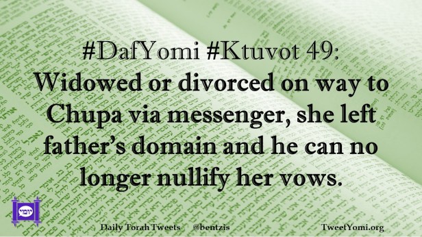 DafYomi, Ktuvot #DafYomi #Ktuvot 49 Date: August 28, 2022Author: ysspitz #DafYomi #Ktuvot 49: Widowed or divorced on way to Chupa via messenger, she left father’s domain and he can no longer nullify her vows. Share this: Share on X (Opens in new window) X Share on Facebook (Opens in new window) Facebook Like Loading... Related