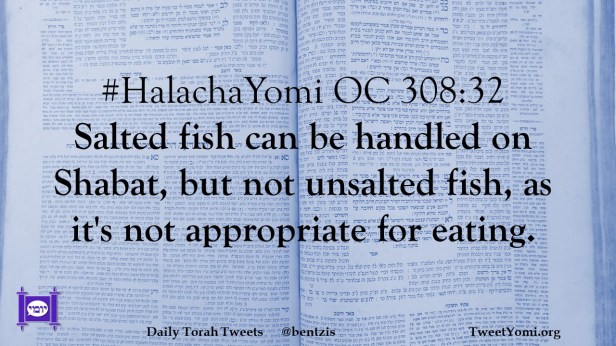 HalachaYomi #HalachaYomi OC 308:32 Date: August 28, 2022Author: ysspitz #HalachaYomi OC 308:32 Salted fish can be handled on Shabat, but not unsalted fish, as it’s not appropriate for eating. Share this: Share on X (Opens in new window) X Share on Facebook (Opens in new window) Facebook Like Loading... Related