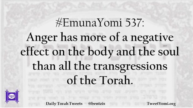 EmunaYomi #EmunaYomi 537 Date: August 29, 2022Author: ysspitz #EmunaYomi 537: Anger has more of a negative effect on the body and the soul than all the transgressions of the Torah. Share this: Share on X (Opens in new window) X Share on Facebook (Opens in new window) Facebook Like Loading... Related
