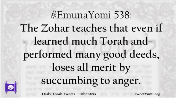 #EmunaYomi 538: The Zohar teaches that even if learned much Torah and performed many good deeds, loses all merit by succumbing to anger.