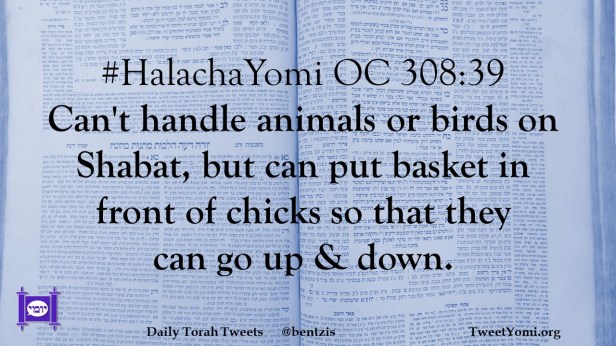 #HalachaYomi OC 308:39 Can’t handle animals or birds on Shabat, but can put basket in front of chicks so that they can go up & down.