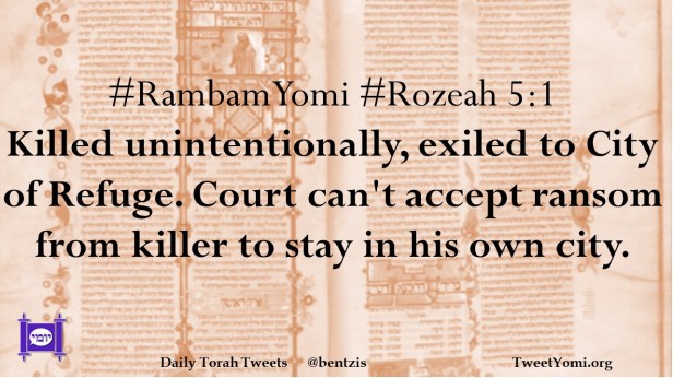 #RambamYomi #Rozeah 5:1 Killed unintentionally, exiled to City of Refuge. Court can’t accept ransom from killer to stay in his own city.