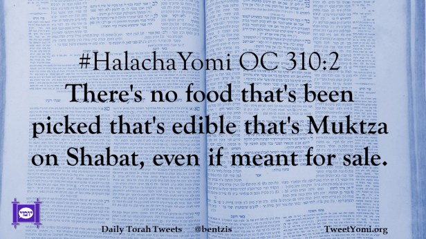 HalachaYomi #HalachaYomi OC 310:2 Date: September 16, 2022Author: ysspitz #HalachaYomi OC 310:2 There’s no food that’s been picked that’s edible that’s Muktza on Shabat, even if meant for sale. Share this: Share on X (Opens in new window) X Share on Facebook (Opens in new window) Facebook Like Loading... Related