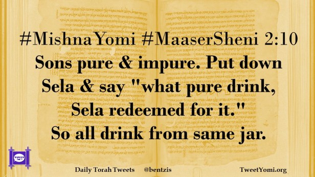 #MishnaYomi #MaaserSheni 2:10 Sons pure & impure. Put down Sela & say “what pure drink, Sela redeemed for it.” So all drink from same jar.