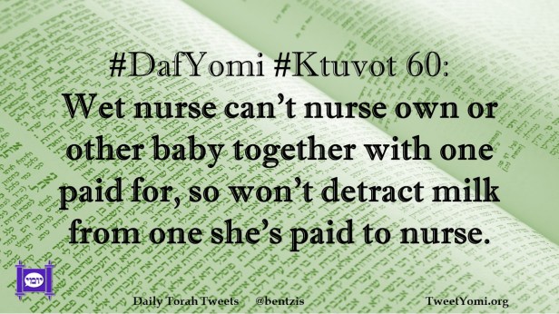 DafYomi, Ktuvot #DafYomi #Ktuvot 60 Date: September 18, 2022Author: ysspitz #DafYomi #Ktuvot 60: Wet nurse can’t nurse own or other baby together with one paid for, so won’t detract milk from one she’s paid to nurse. Share this: Share on X (Opens in new window) X Share on Facebook (Opens in new window) Facebook Like Loading... Related