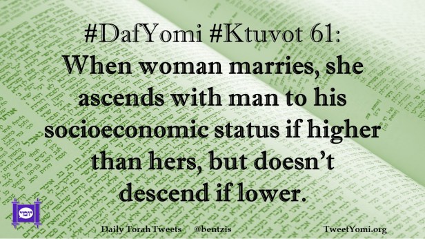 DafYomi, Ktuvot #DafYomi #Ktuvot 61 Date: September 18, 2022Author: ysspitz #DafYomi #Ktuvot 61: When woman marries, she ascends with man to his socioeconomic status if higher than hers, but doesn’t descend if lower. Share this: Share on X (Opens in new window) X Share on Facebook (Opens in new window) Facebook Like Loading... Related